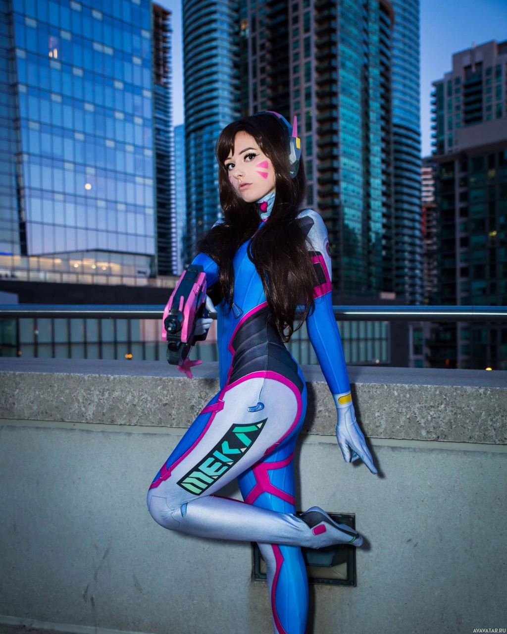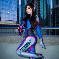 a futuristic design, featuring shades of blue and pink, which are characteristic of D.Va's outfit. They have their hair styled similarly to the character, with