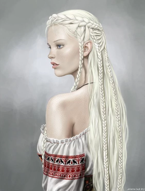 white hair, styled in braids and adorned with beads. They are wearing what appears to be traditional
