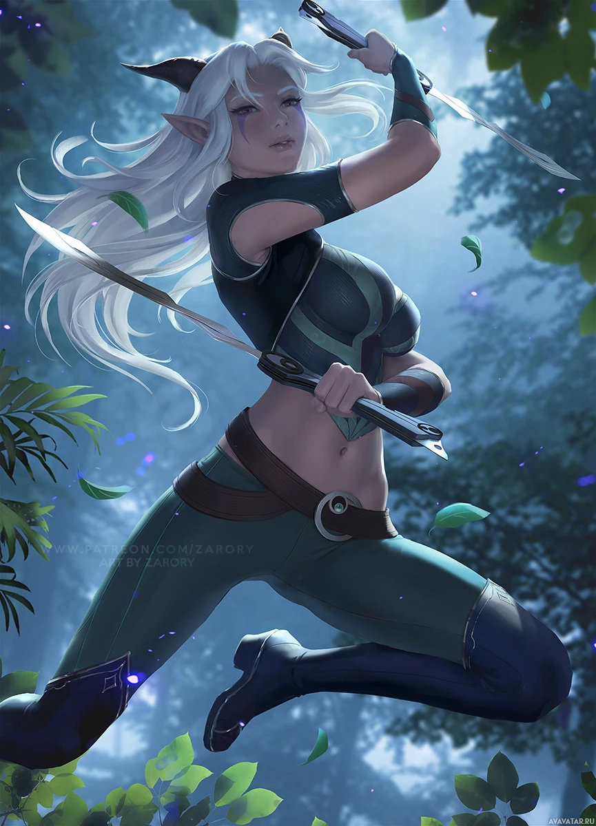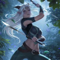 a forest setting. Her attire suggests she might be a warrior or an adventurer from