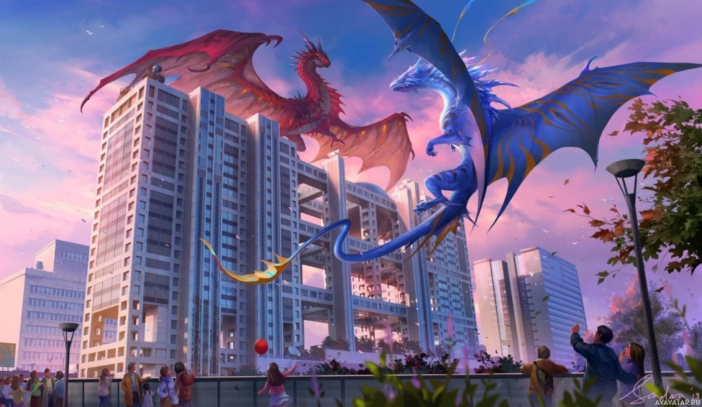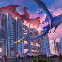 a fantastical scene featuring two dragons flying above a city skyline during what appears to be sunset or sunrise, given the warm colors in the sky. In the foreground, there are several people observing the spectacle, and the overall atmosphere is one of wonder and amazement at the sight of these