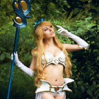 На этом снимке изображена женщина, одетая как Жанна из видеоигры "Лига легенд". Она одета в костюм для косплея, который включает в себя платье в стиле фэнтези с золотыми вставками, и держит в руках посох. Обстановка, по-видимому, представляет собой естественную среду обитания с зеленью, напоминающую лес или парк. Женщина позирует для фотографии, положив руку на бедро, что добавляет игривый элемент в косплей-образ.