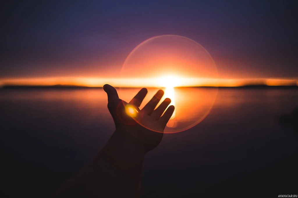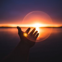 The image features a person's hand reaching up towards the sky. This action is set against the backdrop of a sunset, creating