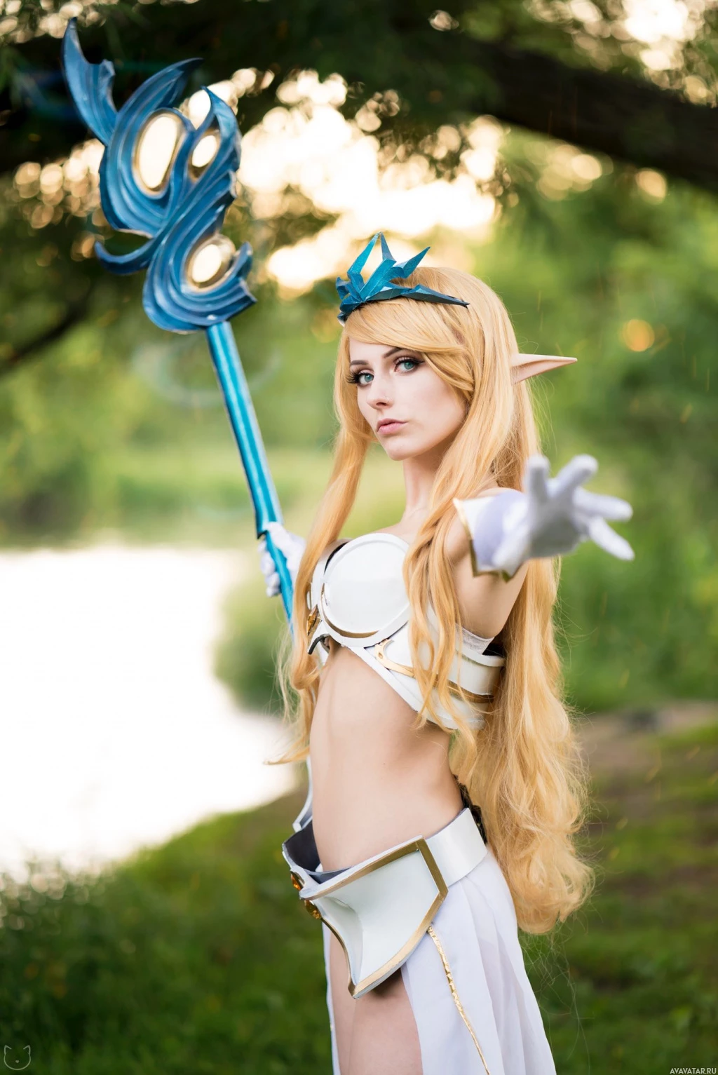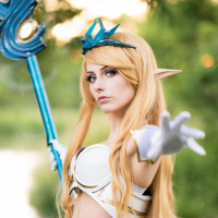 League of Legends." The individual is holding a staff with what appears to be magical or enchanted properties, and their expression suggests they are in character. They are standing outdoors in