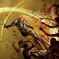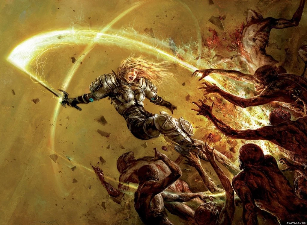 a female warrior is in the midst of battle against a horde of zombie-like creatures. She is holding a sword and has her left arm extended, which might suggest that she is casting