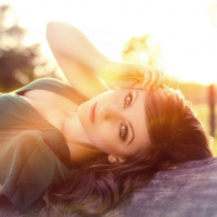 a green dress and have a relaxed pose, looking up towards the camera with a slight smile. The setting suggests it might be