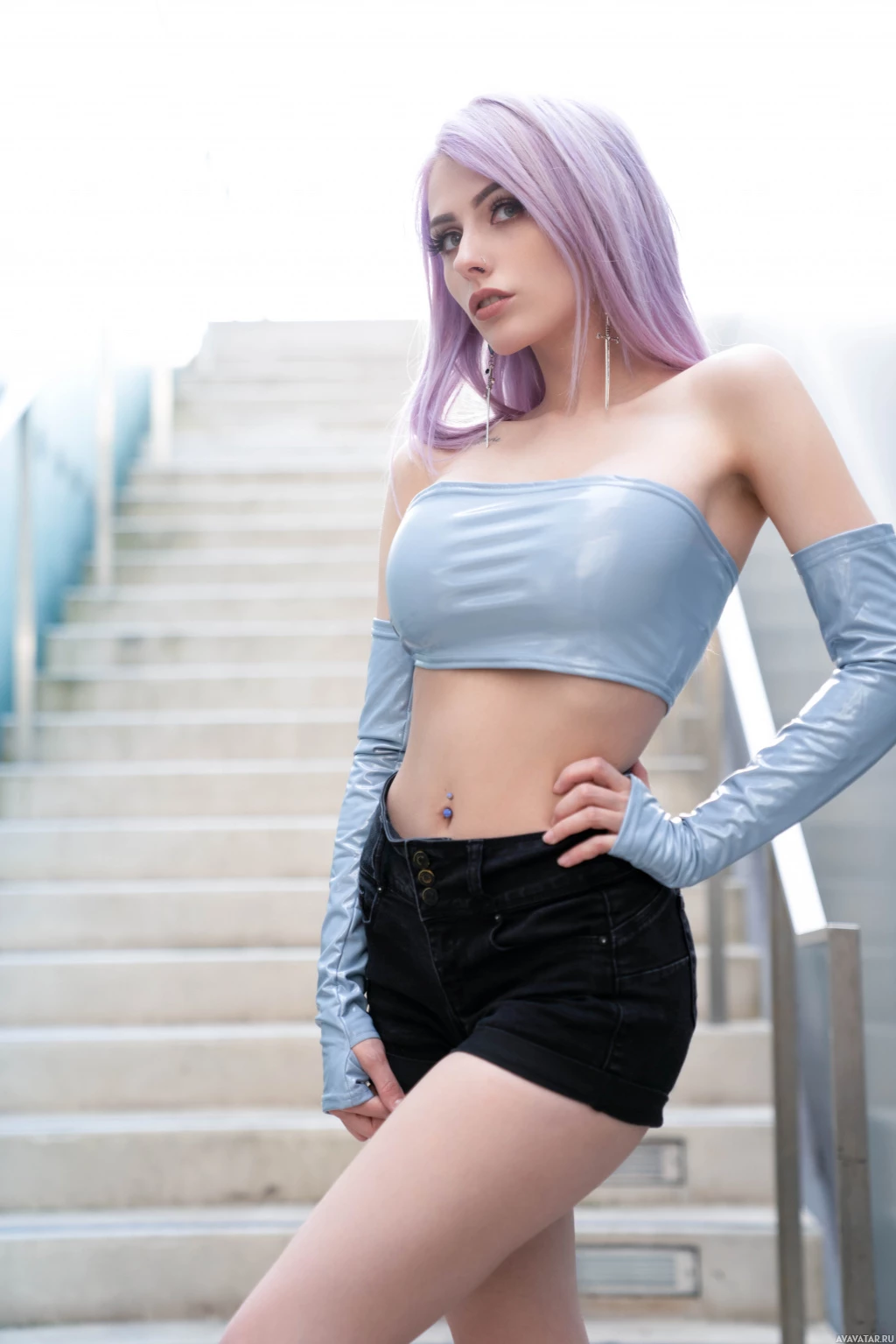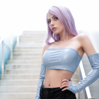The image shows a person with purple hair, wearing a blue crop top and shorts. They are posing confidently in front of stairs, seemingly on an outdoor street setting. The person has a visible tattoo on their upper arm.