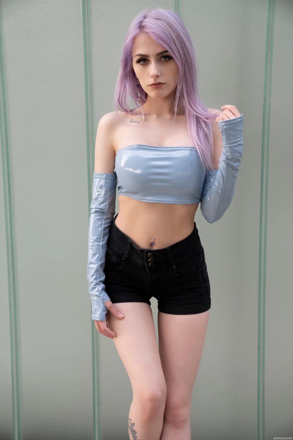 crop top and black shorts. Their hands are placed near their thighs, and they have one foot raised slightly as if posing for the photo. The individual has visible tattoos on their lower legs. It's important to respect privacy and avoid making assumptions based on appearance or context that may not be relevant to the image content.