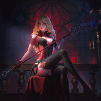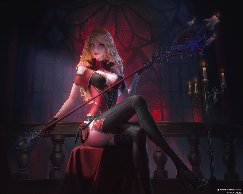 a magical staff in the other. Her attire and gear suggest that she is ready for combat, and her