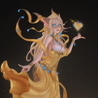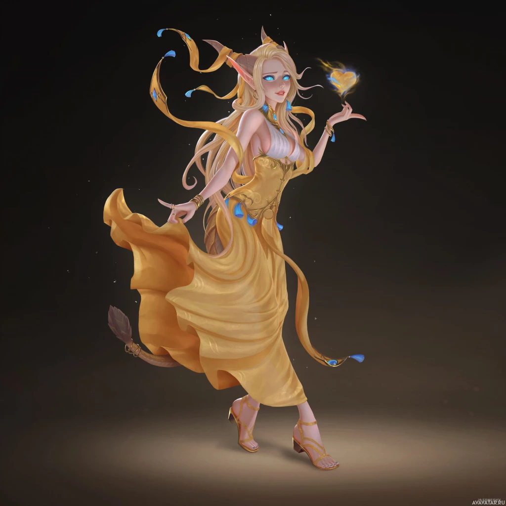 blonde hair that seems to be flowing around her face, suggesting movement or magic at play. She's wearing a dress that resembles golden silk, complete with intricate details that may indicate a high status or