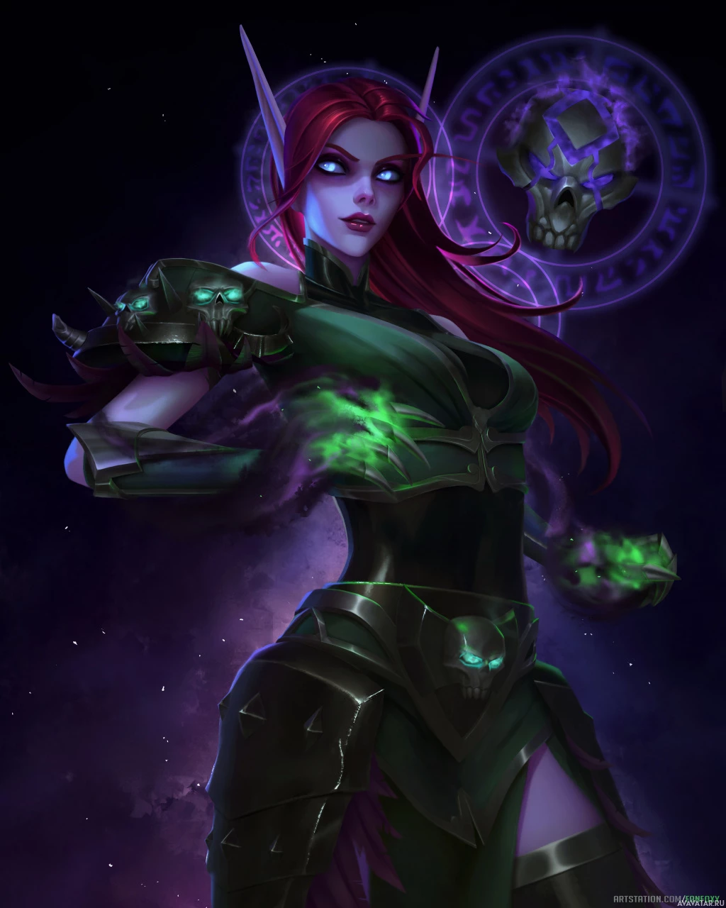 red hair and is wearing armor that suggests she might be part of the drow race, which are known for their dark skin tone. She is set against a backdrop that includes mystical elements such as
