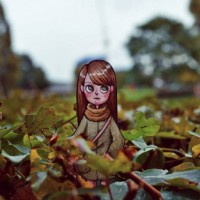 In the image, there is a small figurine or toy of a girl placed in front of a background filled with autumnal leaves. The girl on the toy has blonde hair and is wearing what appears to be a brown outfit. She seems to be looking upwards, possibly towards trees or the sky.