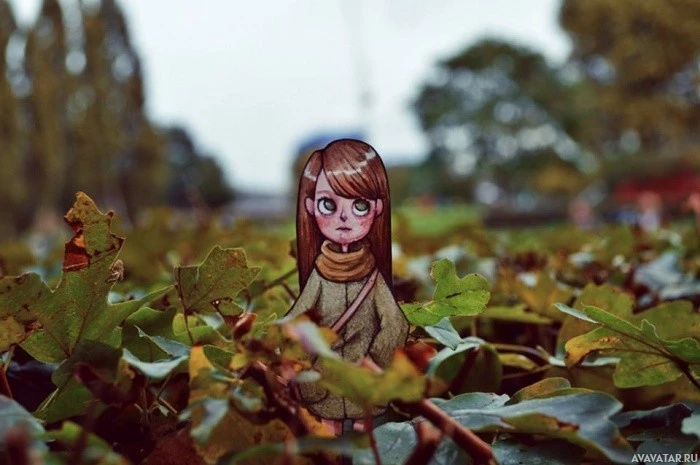 На картинке изображена маленькая фигурка или игрушка девушки, помещенная перед фоном, заполненным осенними листьями. Девушка на игрушке имеет светлые волосы и носит то, что кажется коричневым нарядом. Она смотрит вверх, возможно, к деревьям или небу.