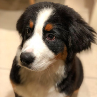 brown coat and white markings, particularly on its muzzle and chest area. The dog is looking directly at the camera, giving it a curious or attentive expression. It appears to be indoors, as suggested by