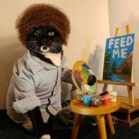 a human artist. The cat is seated on an easel, with