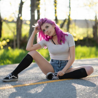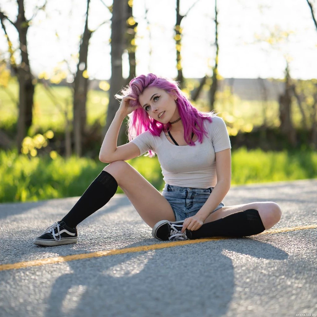 pink hair and is wearing casual clothing, including a gray t-shirt and denim shorts. They are resting their hand on their head as if they might be tired or contemplating something. The setting appears to be outdoors during daylight hours, with green vegetation and