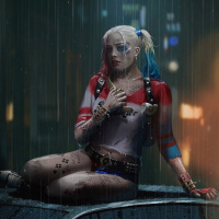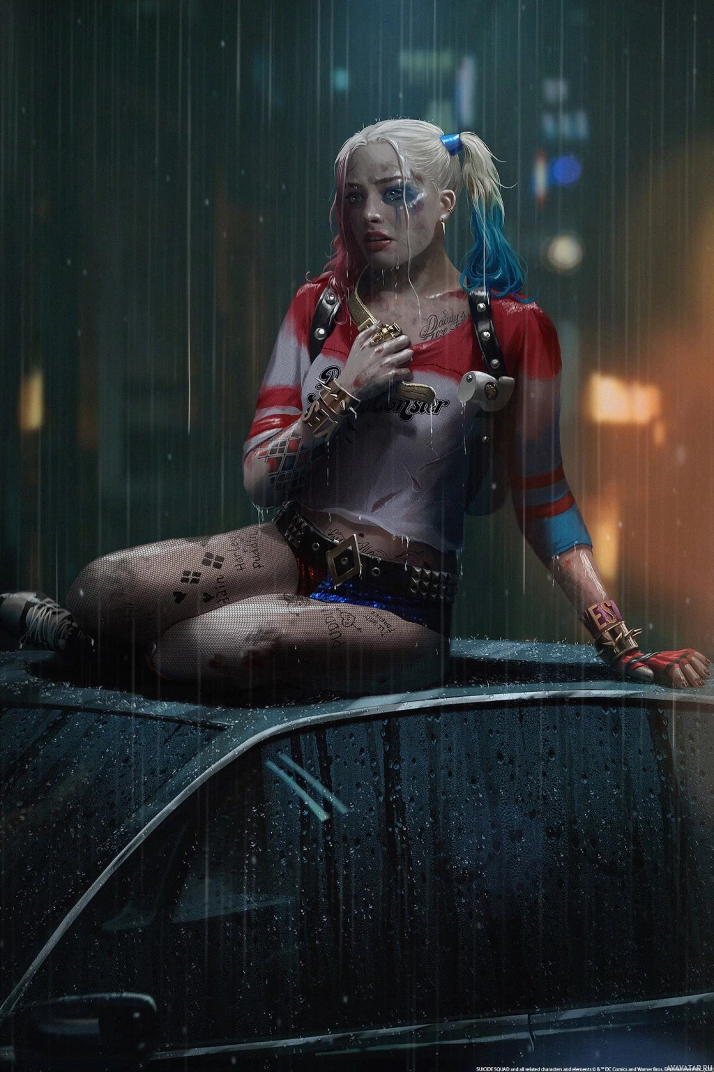 Harley Quinn, sitting on the hood of a car in what appears to be rainy weather. She is wearing her