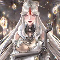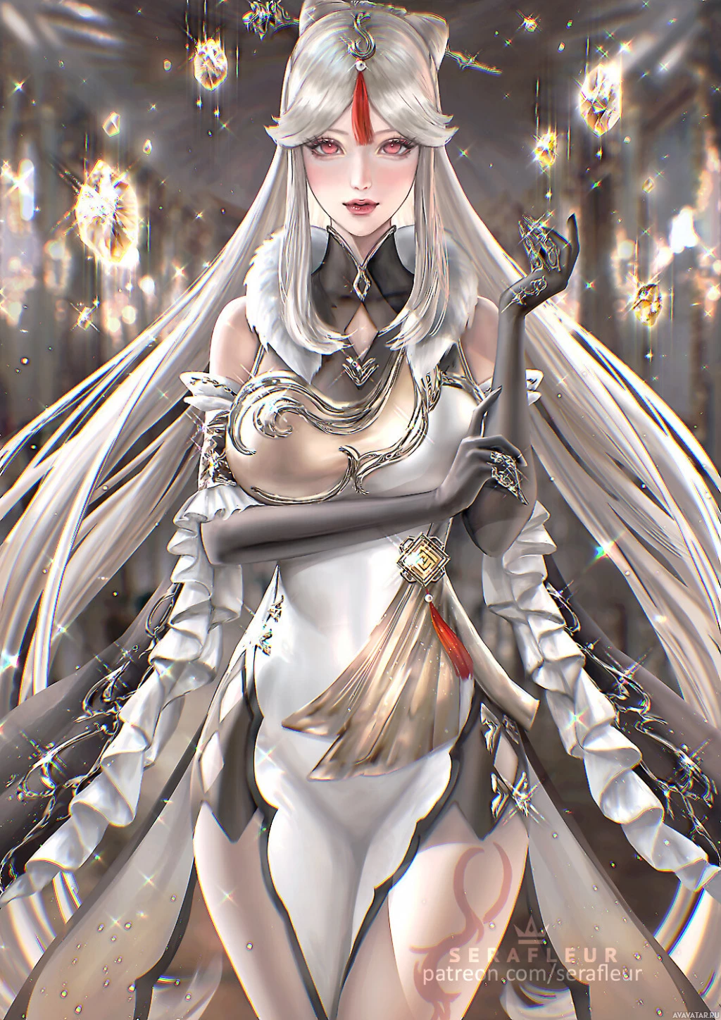 white hair and intricate, elaborate clothing. She appears to be standing in