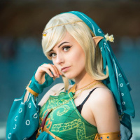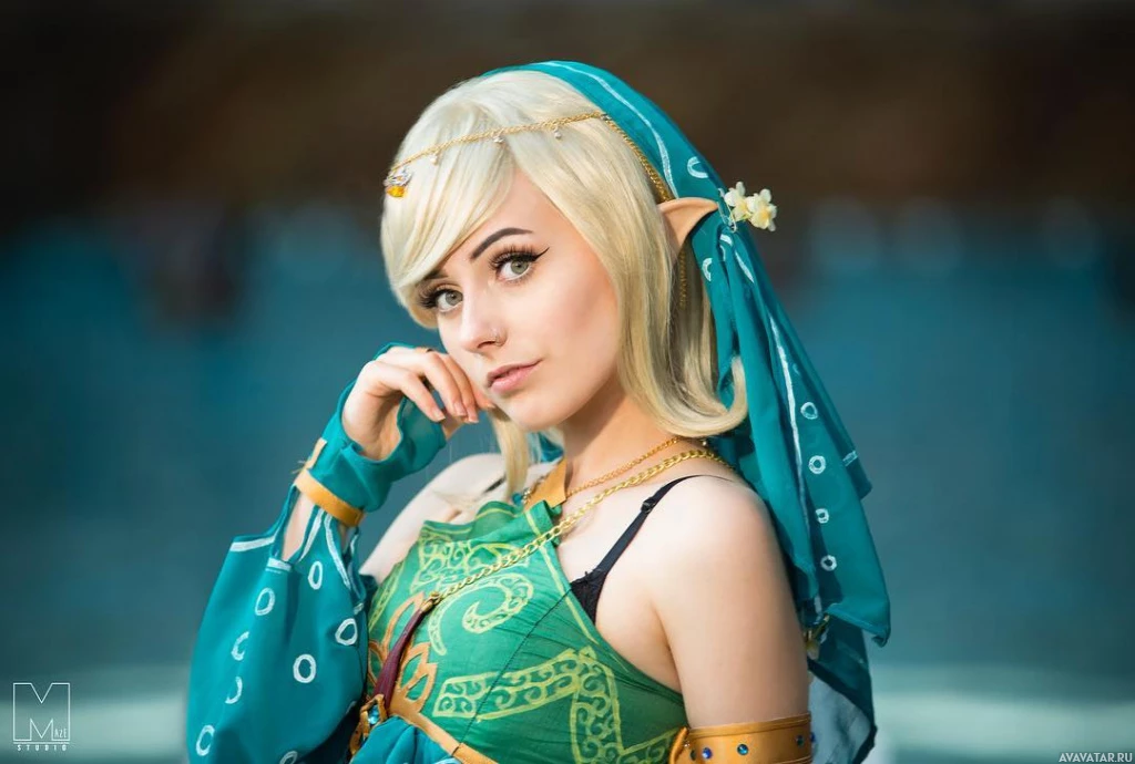 In the image, there is a person dressed in a costume that resembles a character from the "The Legend of Zelda" series, which is a popular
