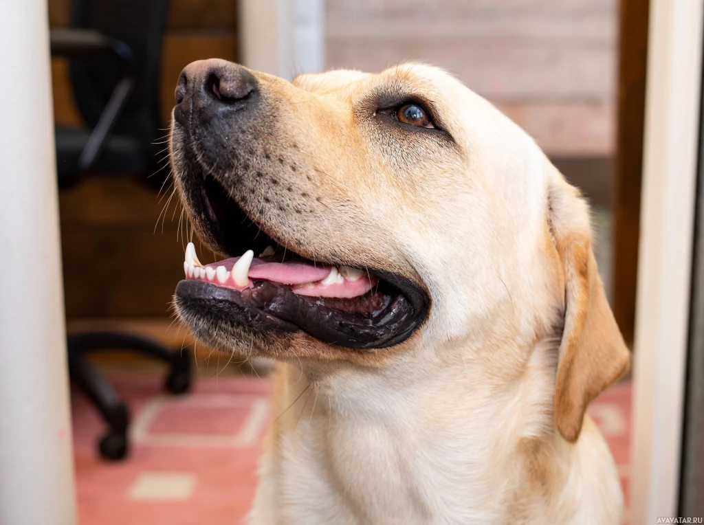 На картинке изображен лабрадор-ретривер, который является разновидностью собаки. Судя по всему, он находится в помещении, возможно, в офисе или комнате с такой мебелью, как стулья и столы. Кажется, что собака смотрит прямо в камеру, и ее пасть слегка приоткрыта, как будто она тяжело дышит или чего-то ждет.