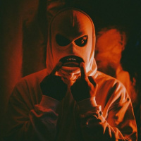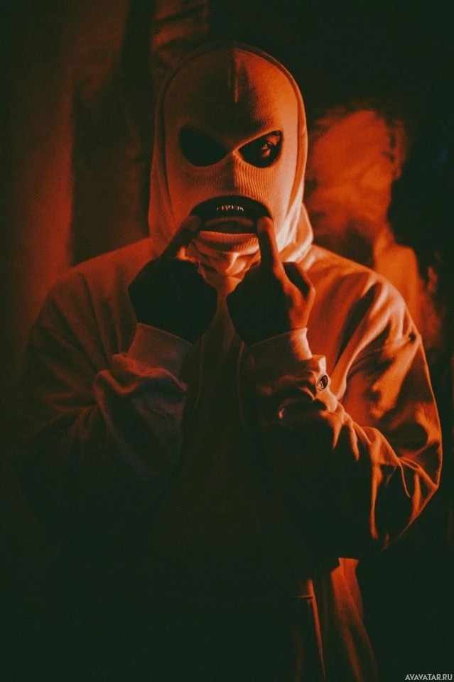 a white face mask and what looks like red or yellow markings on the suit. Their hands are up near their mouth, and they seem to be looking directly at the camera with a focused or intense expression. The background is dimly lit, creating an atmosphere that could be interpreted as mysterious or dramatic.