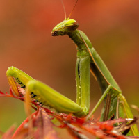 The image shows a pair of mantis insects. One is larger and more prominently positioned, while the other is smaller and partially obscured. They are set against a backdrop of red foliage that appears to be autumnal, possibly maple leaves, with hints of orange and