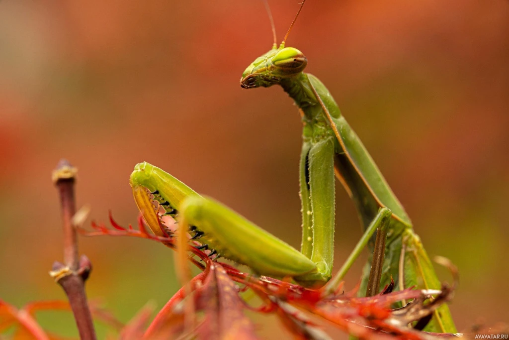 red hues indicating the season. The mantis on the left has its wings extended slightly away from its body.