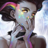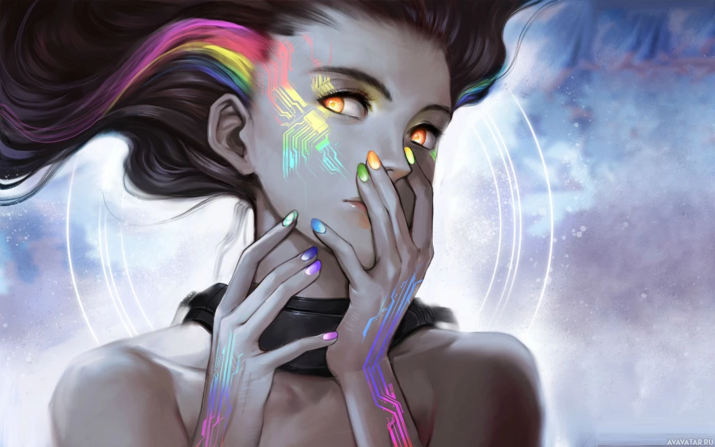 vibrant hair and the presence of technological or futuristic elements in the background. These could be interpreted as parts of a larger