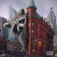 This image features a large, digitally manipulated raccoon superimposed onto a city skyline. The raccoon appears to be peeking out from behind a building as if it were a resident of the city. The picture is meant to be humorous and fun, combining elements of wildlife with an urban environment.