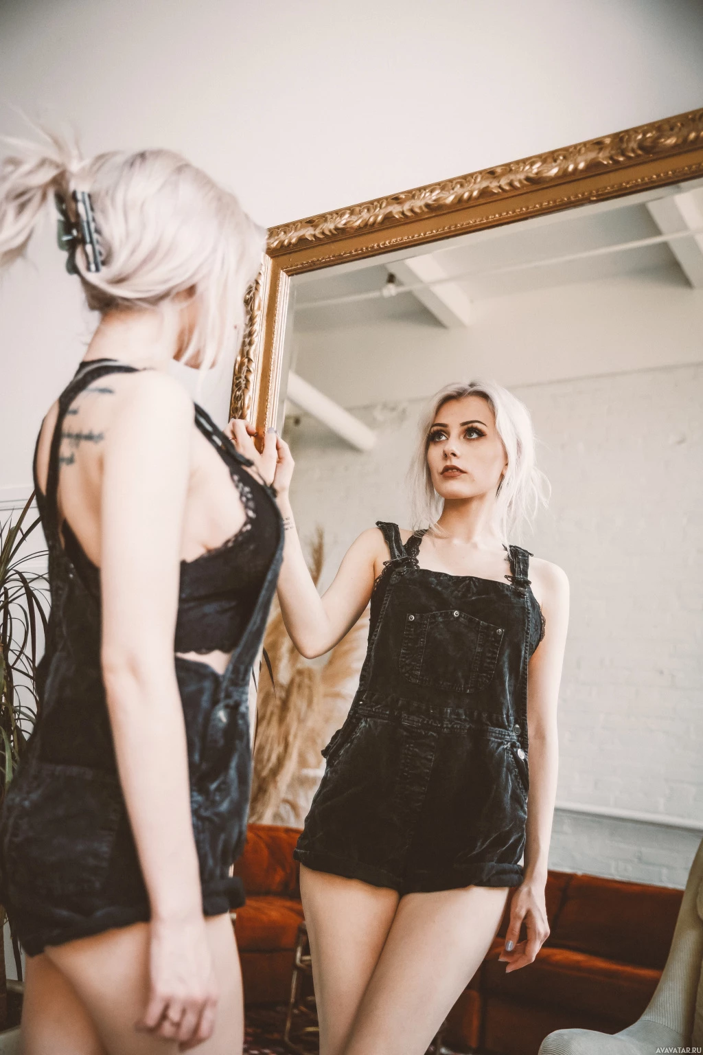 short sleeves, which might be considered lingerie or a similar style of clothing. Her hair is styled up and she has visible tattoos on her skin. The setting suggests an indoor environment, possibly
