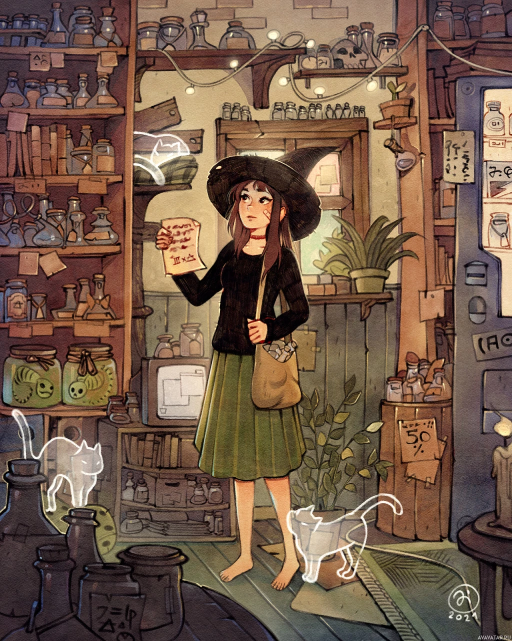 an illustrated scene featuring a girl wearing a witch hat and holding what appears to be a spell or paper with magical content. She is standing in a shop that has various bottles, possibly containing potions or ingredients for
