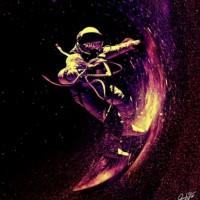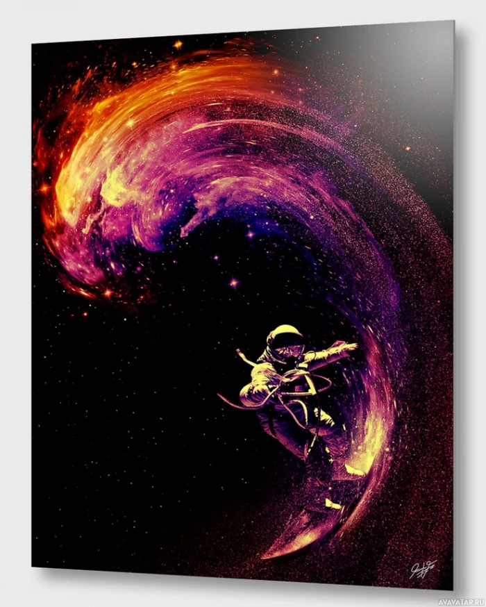 Картинка показывает художественное произведение с участием серфера, едущего на волне. Что необычно в этой картине, так это то, что обстановка, кажется, находится в космосе, а звезды и космические элементы создают фон для сцены серфинга. На картинке нет видимого астронавта; похоже, что это творческий подход к серфингу в окружающей среде.