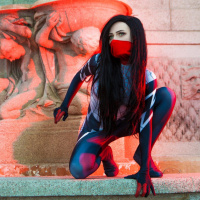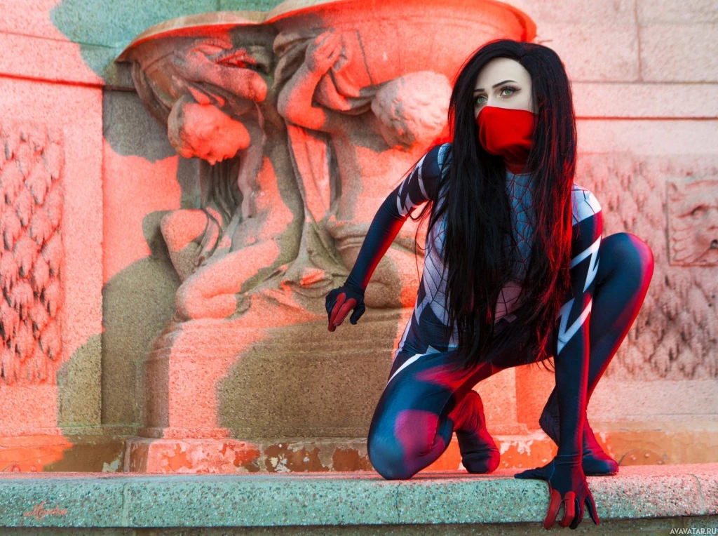 The image features a person dressed in cosplay, portraying the character Silk. The individual is kneeling on