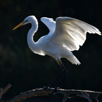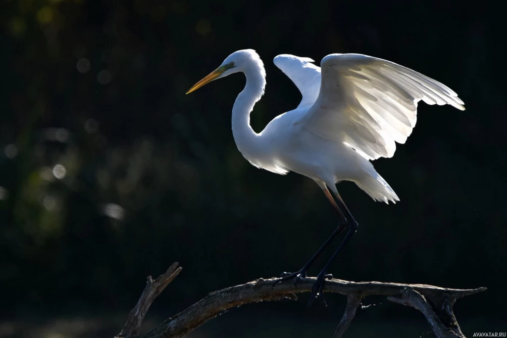 The image features a white heron, a type of wading bird known for its