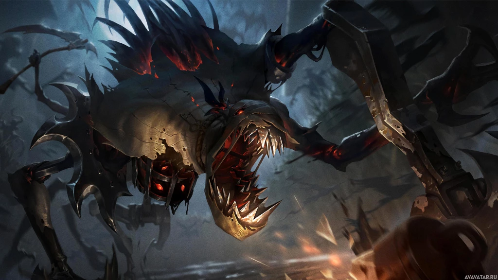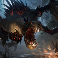 sharp teeth, claws, and an intimidating appearance, possibly a demonic or mythical being, set in a dark, misty environment that suggests a battle or confrontation is taking place. The art style is realistic with