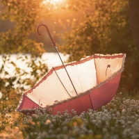 The image depicts a red and white umbrella with its handle pointing downwards, placed on the grass in what appears to be a serene,