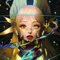 The image features a stylized digital artwork of a girl with blonde hair. She has large blue eyes and is wearing an intricate headpiece that includes what appears to be feathers or possibly wings. The background suggests a mystical or cosmic theme, with light effects and star-like objects that create a magical atmosphere around her.