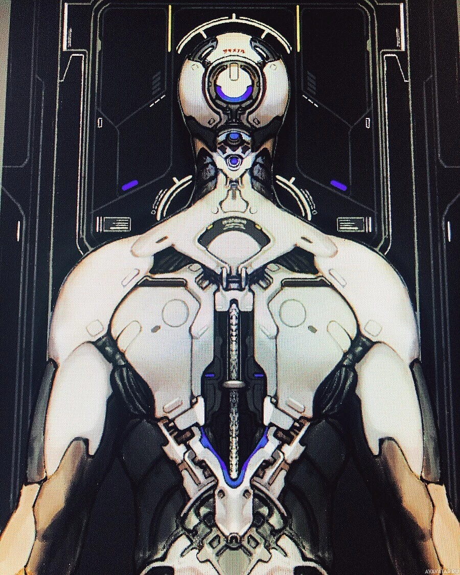 The image shows a humanoid robot from behind, which appears to be part of a sci-fi or