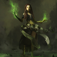 a female figure who appears to be casting a spell or performing some form of magic. She has