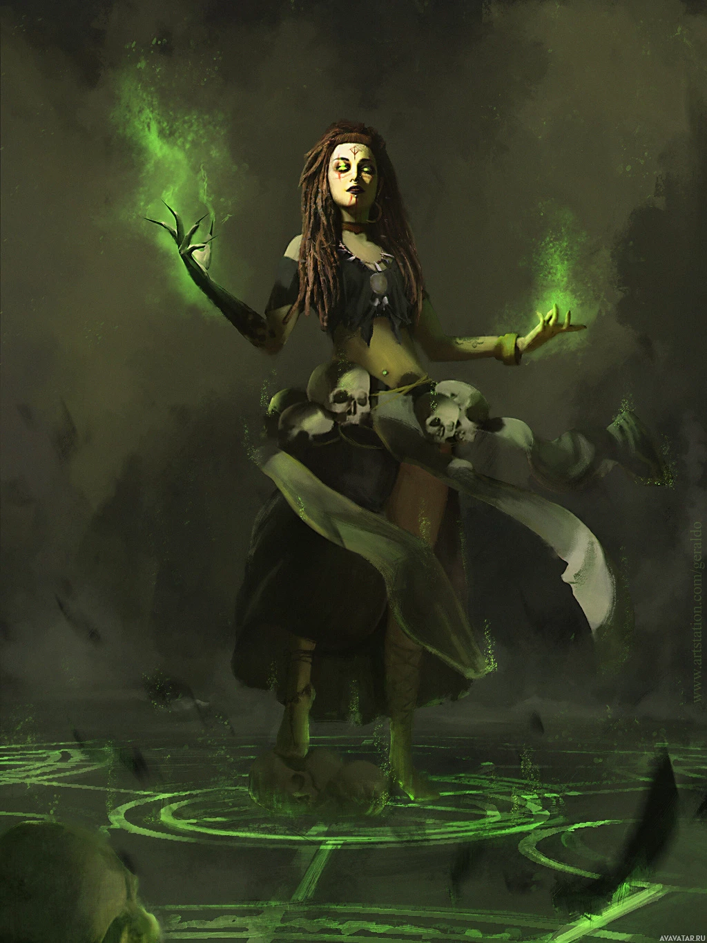 ominous atmosphere with a foggy background and the presence of a skull on the ground, which further emphasizes the mystical and possibly macabre nature of the scene.