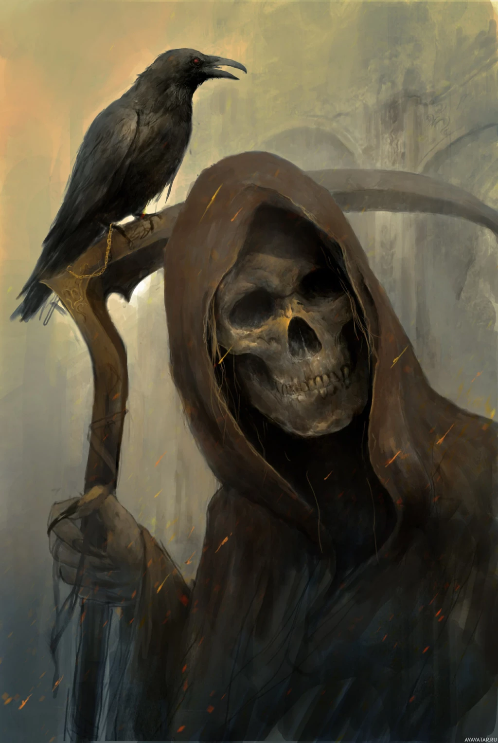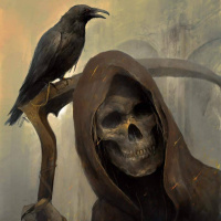 Grim Reaper," and the crow perched on the staff might symbolize the bird's association with ominous events or bad omens in various mythologies and folklore. The overall theme of the image suggests a connection between death, evil, or misfortune represented by the figure and the crow.