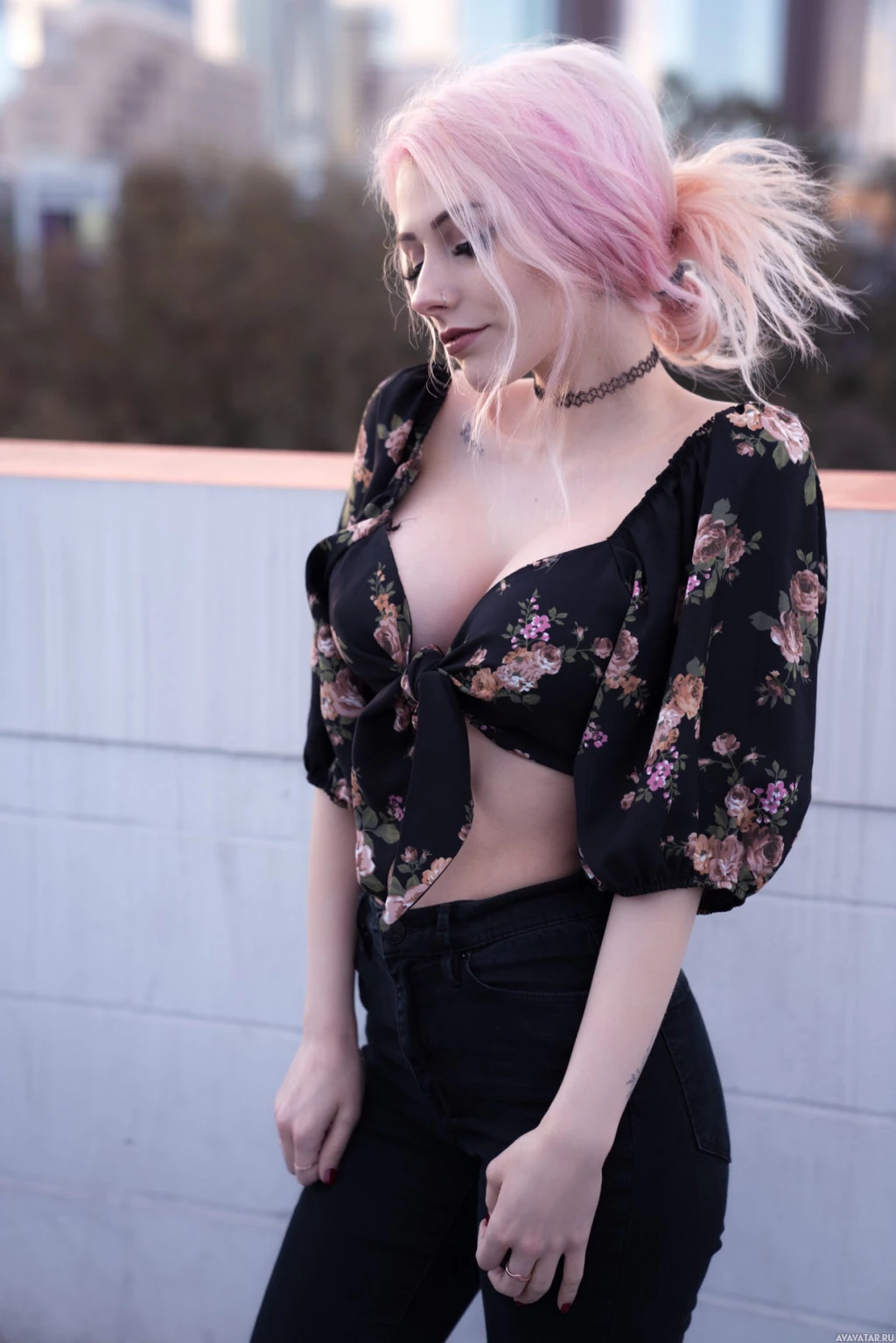 a black top with floral detailing. The background suggests