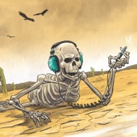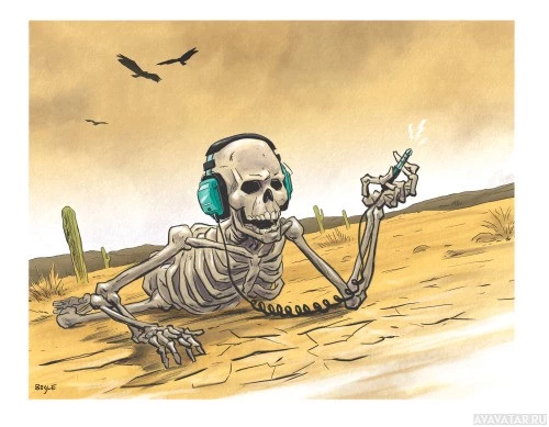 The image shows a skeleton lying down with headphones on, appearing to be listening to music or perhaps