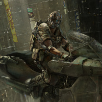 fiction scene with a character riding on the back of a mechanical vehicle or robot. The setting appears to be