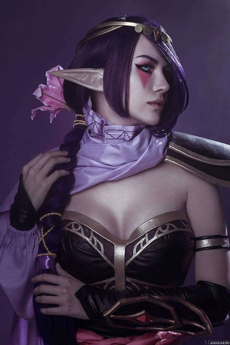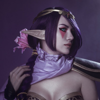 Templar Assassin from Dota 2. The character is known for her purple and black armor, which is visible in the image. The costume includes intricate details such as shoulder guards and gloves. The character's face is obscured by a mask, which features a prominent red