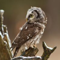 a tree branch. The owl appears to have distinctive