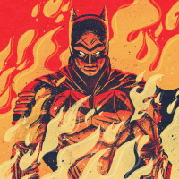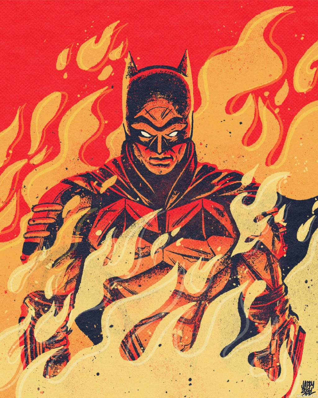 dramatic lighting emphasizes the theme of fire or destruction that could be linked to a particular storyline or event in the Batman narrative. This image captures the intensity and action typical of the Batman character, often associated with overcoming adversity and protecting