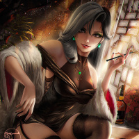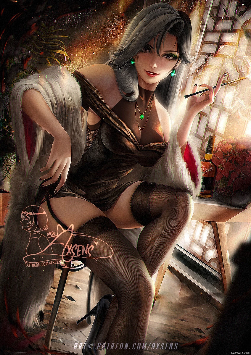 an illustrated character, which appears to be a female with gray hair. She is wearing a black and red dress with lace details and stockings. She has a smirk on her face and is holding a brush in her hand, suggesting she might be an artist or a performer. The setting looks like