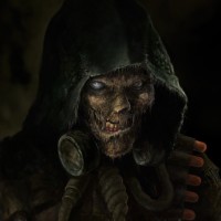 mechanical components visible on its face and body, suggesting that this character may have been altered or enhanced in some way. The overall atmosphere of the image is dark and moody, fitting for what seems to be a horror-themed setting.