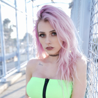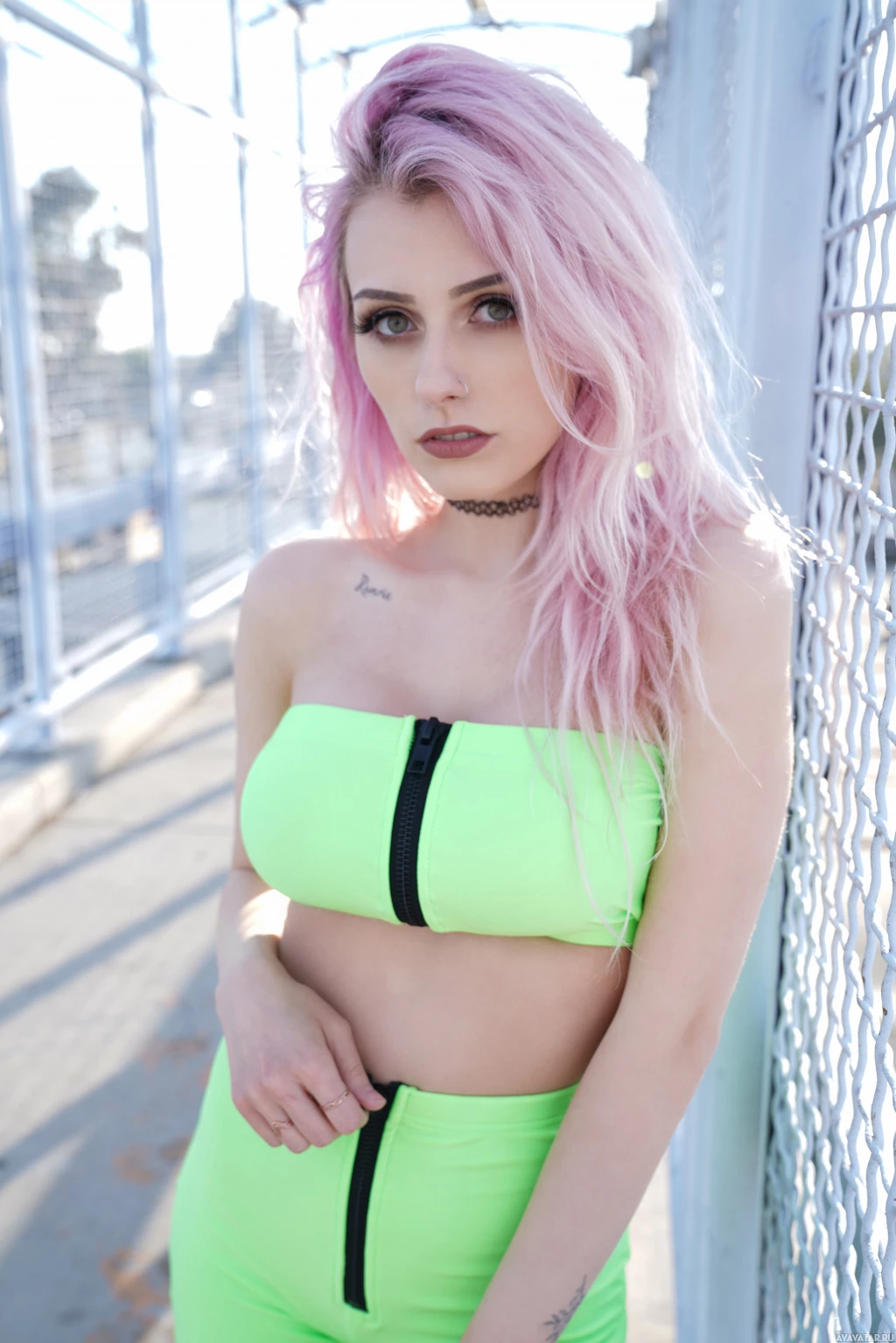pink hair wearing a yellow and green outfit. They are posing in front of a chain
