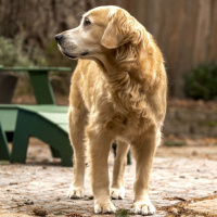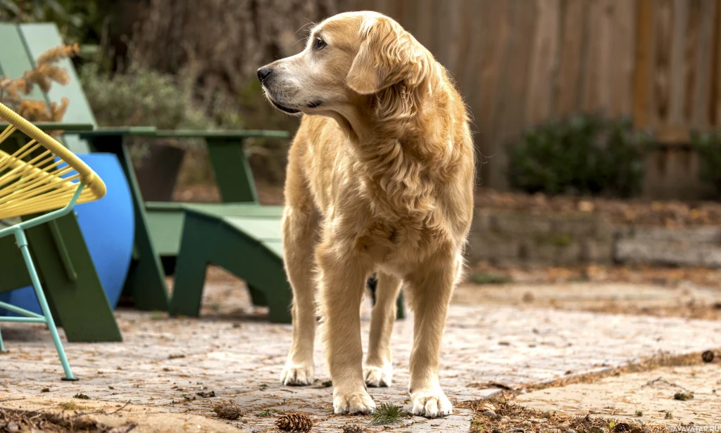retriever dog standing on what appears to be an outdoor patio or porch. The dog is looking off to the side, and there are some chairs visible in the background. The setting suggests